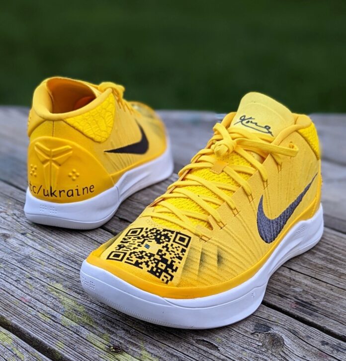 - Svi Mykhailiuk will wear sneakers displaying a “Shoe-R”, which is a scannable QR code that takes users to a bitcoin wallet address where bitcoin or other currencies can be donated.
