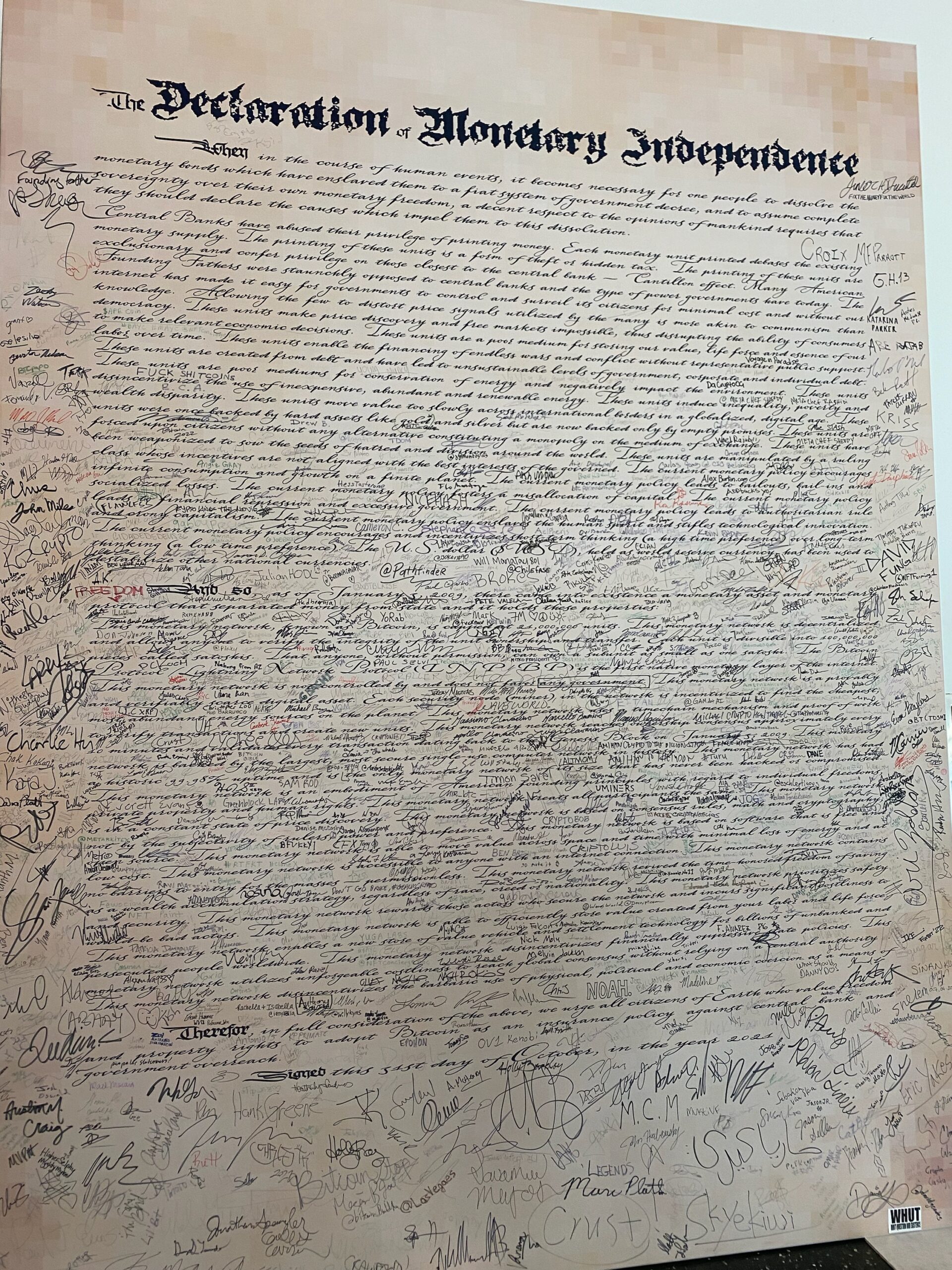 As Bitcoin 2022 got underway, at the largest gathering of Bitcoiners in the world there stood an impressive 9 foot by 12 foot document that was the first and largest printed version of the Declaration of Monetary Independence (DoMI). For those of you who would like to read it and sign it electronically you may go here. It stood just outside the Nakamoto Stage where the foot traffic from attendees who arrived each morning walked right past it. By the close of the event on Saturday, it is estimated that there were thousands of signatures and it resembled street art more than a replica of the original Declaration of Independence.