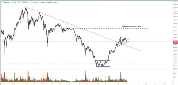 Next, the rally off the $350 support area showed a high amount of volume indicating demand is returning to the ether markets. The rally off support broke the downward trend where we are currently consolidating in a substantial bullish pennant: