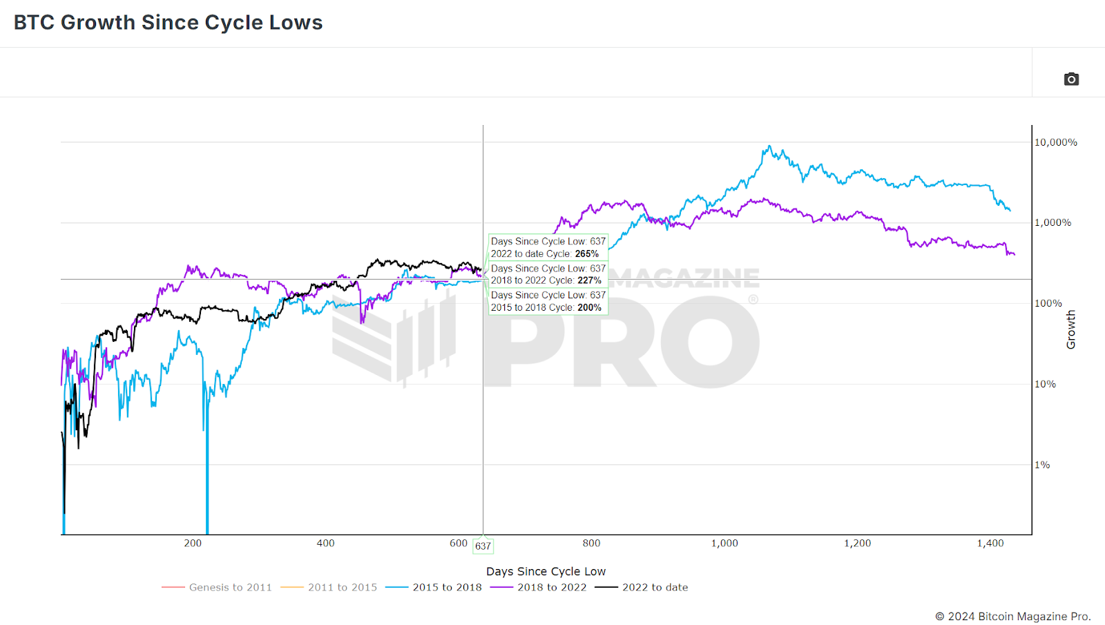 There’s a theory that each Bitcoin cycle has diminishing returns, with lower percentage gains than the previous cycle. If we compare the current cycle to previous ones, it’s clear that Bitcoin has already outperformed both the 2015-2018 and 2018-2022 cycles regarding percentage gains. This outperformance might suggest that Bitcoin has gotten ahead of itself, necessitating a cooling-off period.