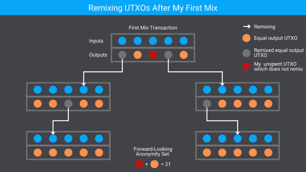 My equal output UTXO does not need to remix for the crowd in which I am hiding in to grow. Whether it is my UTXO which remixes or one of my mixing peers, there is no way to tell on-chain which UTXO from the first mix has been remixed. There are now nine equal outputs connected to my first mix, so my spying employer would have to assume I could be any one of them.